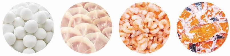 possono essere pesati tutti i tipi di prodotti surgeleti, grazie alla struttuta in acciaio inox bugnato e coperture in plastica inaderente con velocità da 65 (10 teste) a 120 (14 teste) pesate al minuto da 10 fino a 1000 o 1500 gr. .